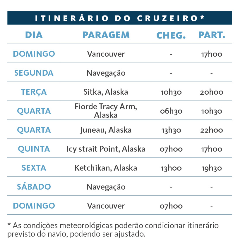 • Cruzeiro de 7 noites Royal Caribbean – Serenade of the Seas, em regime de pensão completa a bordo: Vancouver, Sitka, Fiorde Tracy Arm, Juneau, Icy Strait Point, Ketchikan e Vancouver.