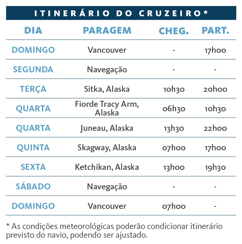 Nota: Na data acima, não será possível a ligação a Monteral a partir do Porto, pelo que teremos incluído transfer terrestre para o percurso Porto / Aeroporto de Lisboa. Ainda nesta partida, a escala em Skagway será substituída por Icy Strait Point. Consulte o programa detalhado na respetiva data.