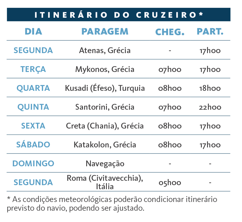 • Cruzeiro Royal Caribbean – Brilliance of the Seas, de 7 noites em regime de pensão completa a bordo: Atenas, Mykonos, Kusadasi, Santorini, Creta, Katakolon e Roma