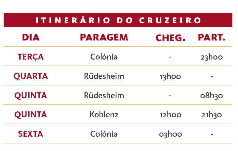 • Cruzeiro de 3 noites Nicko Cruises – Rhein Symphonie, em regime de pensão completa a bordo: Colónia, Rüdesheim e Koblenz.