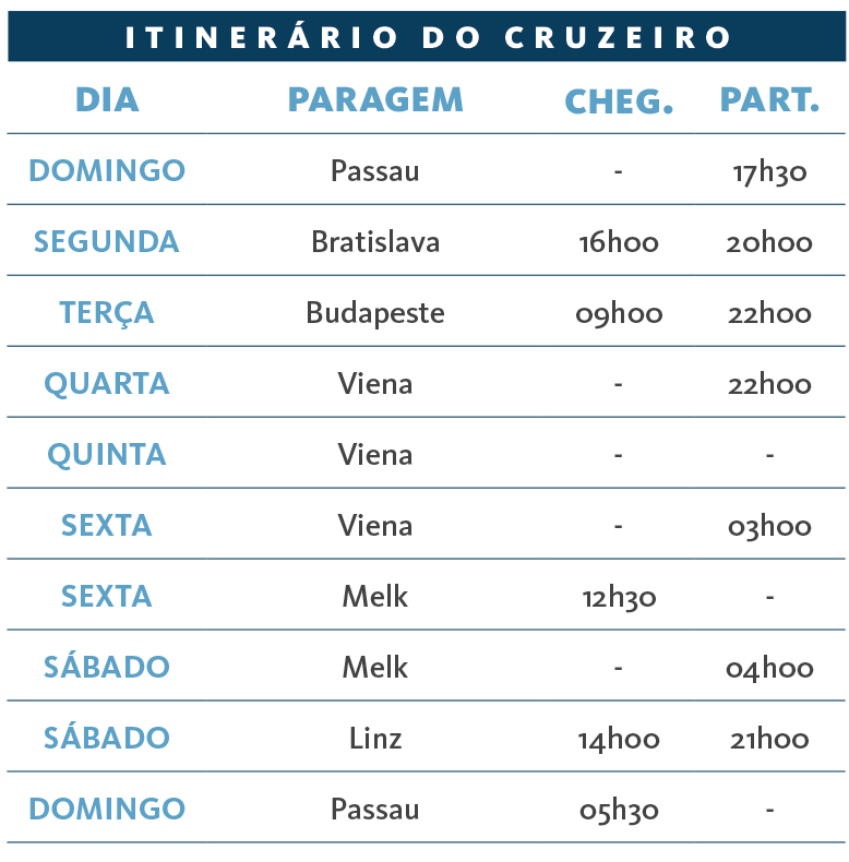 • Cruzeiro de 7 noites Nicko Cruises – Celina, em regime de pensão completa a bordo: Passau, Bratislava, Budapeste, Viena, Melk e Linz.