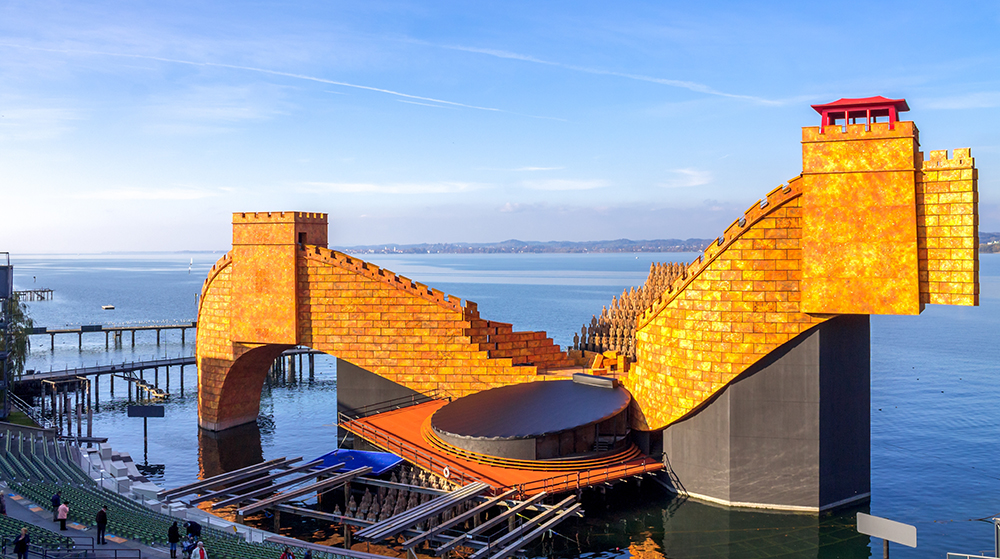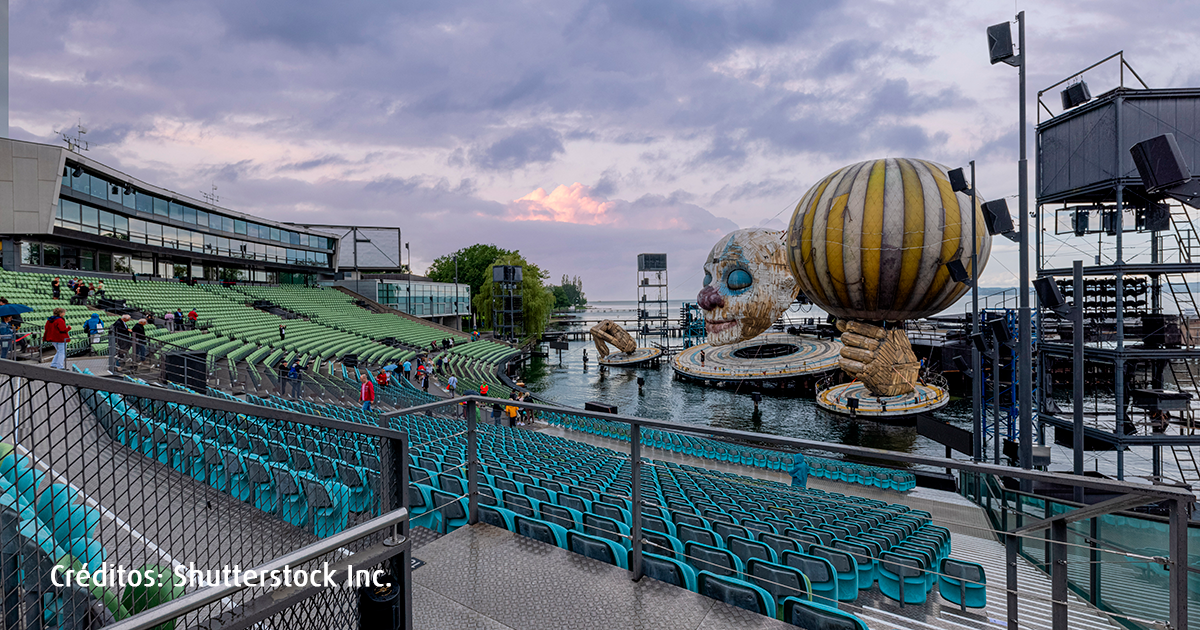 Nota sobre a imagem: Palco flutuante sobre o Lago Constança, em edições anteriores do Bregenzer Festspiele (créditos: Shutterstock Inc. | Imagem meramente ilustrativa, já que o cenário é renovado a cada espetáculo).
