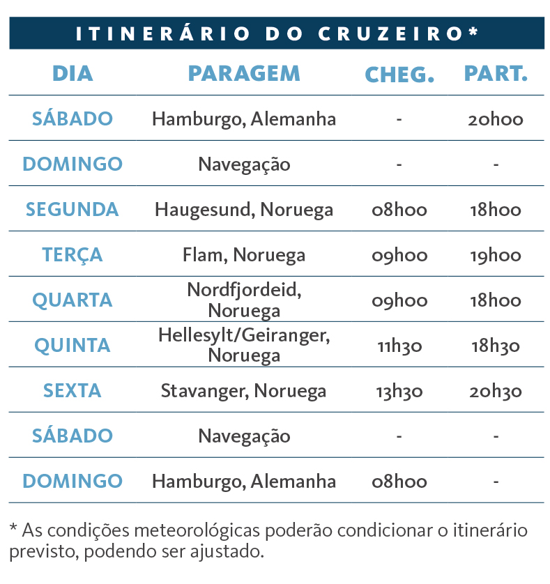 • Cruzeiro Costa Favolosa de 8 noites, em regime de pensão completa a bordo: Hamburgo, Haugesund, Flam, Nordfjordeid, Hellesylt, Geiranger, Stavanger.