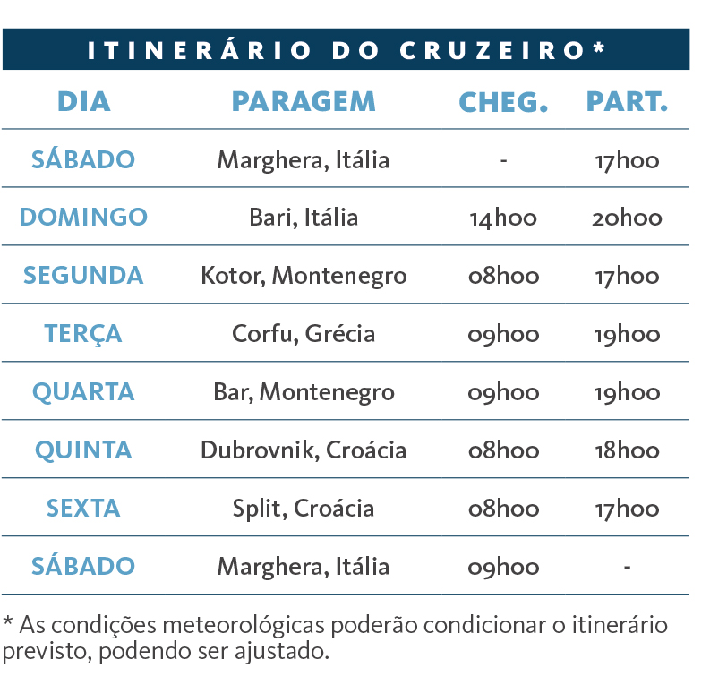 • Cruzeiro Costa Deliziosa de 7 noites em regime de pensão completa a bordo: Marghera, Bari, Kotor, Corfu, Bar, Dubrovnik e Split.